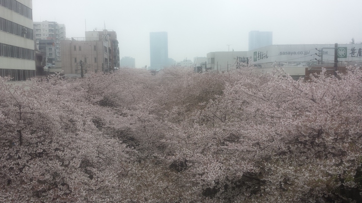 朝のニュースでは「花散らしの雨になるでしょう。」と言ってましたが、中目黒の桜はこの雨にも負けず、ずいぶん咲き続けてますよ。