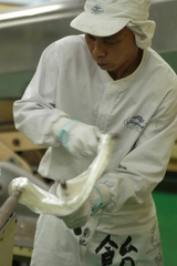 菊地は宮川製菓で飴造り30年の職人です。中でも細工飴(飴をひいて空気を含ませたり飴同士を組んできれいな模様をつけたりする)技術は今でもピカイチ!工場の中では、しかめっ面で黙々と飴を造っていて、声をかけづらい雰囲気のときもあります。でも、「飴の生地がちょっと残ったから、お遊びで作ったよ。」といいながら、昔懐かしい渦巻きのペロペロキャンディや金太郎飴などを、事務のスタッフの席まで持ってくることもしばしば。